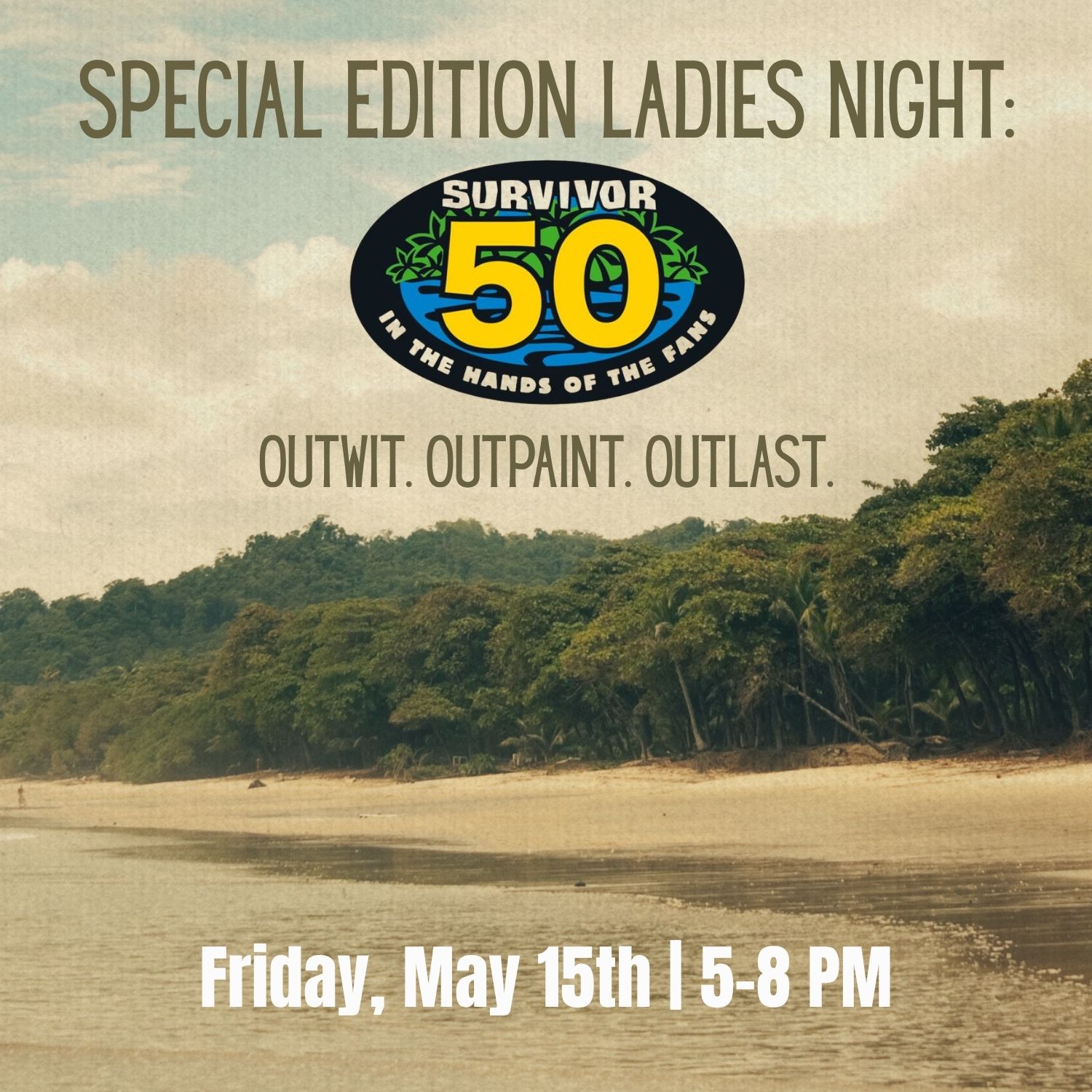 Grab your tribe and get ready for a Survivor-Themed Ladies Night at The WOW! Factory on Friday, May 15th from 5–8 PM! This is your chance to channel your inner castaway—no bugs or island required.